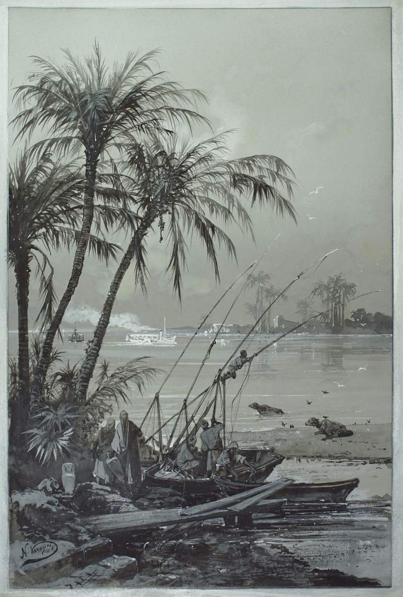Наиболее ранние работы из собрания Русского музея – серия акварелей братьев Никанора и Григория Чернецовых. В Египте они провели полтора осенних месяца 1842 года, путешествуя по Нилу и пустыне. Предметом внимания художников были древние памятники, египетские города – Александрия, Каир, Луксор. Примерно через полвека, в начале 1890-х годов Египет посетил князь Григорий Гагарин. Его акварели запечатлели не только древние памятники, но и жизнь арабов на этих землях в конце XIX века.
