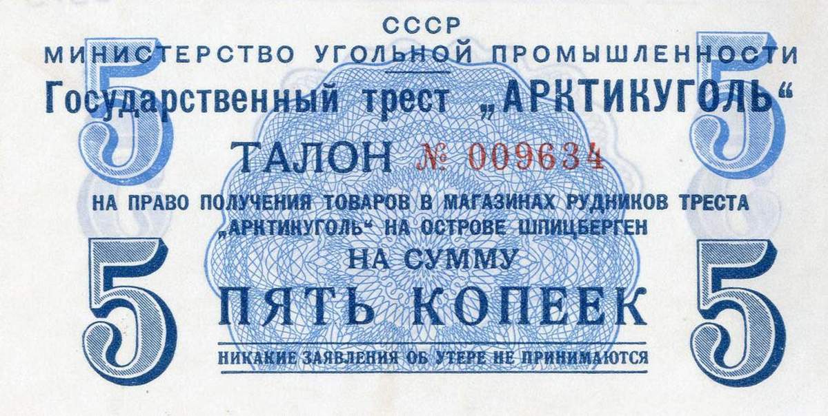 Талон на право получения товаров в магазинах рудников треста «Арктикуголь» на о. Шпицберген, на сумму 5 копеек
