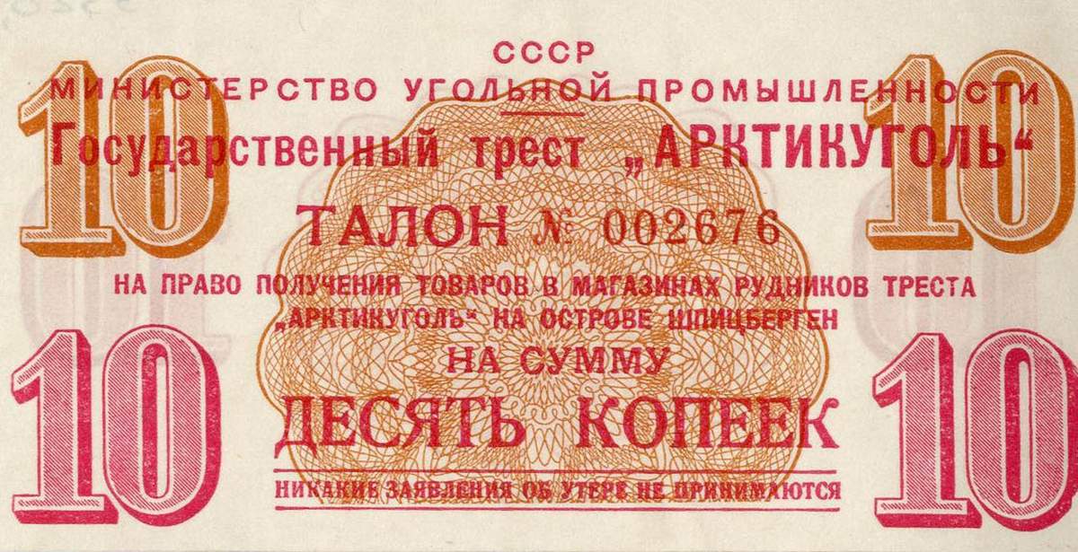 Талон на право получения товаров в магазинах рудников треста «Арктикуголь» на о. Шпицберген, на сумму 10 копеек