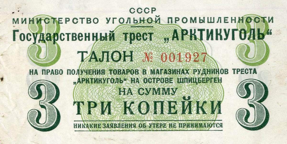 Талон на право получения товаров в магазинах рудников треста «Арктикуголь» на о. Шпицберген, на сумму 3 копейки