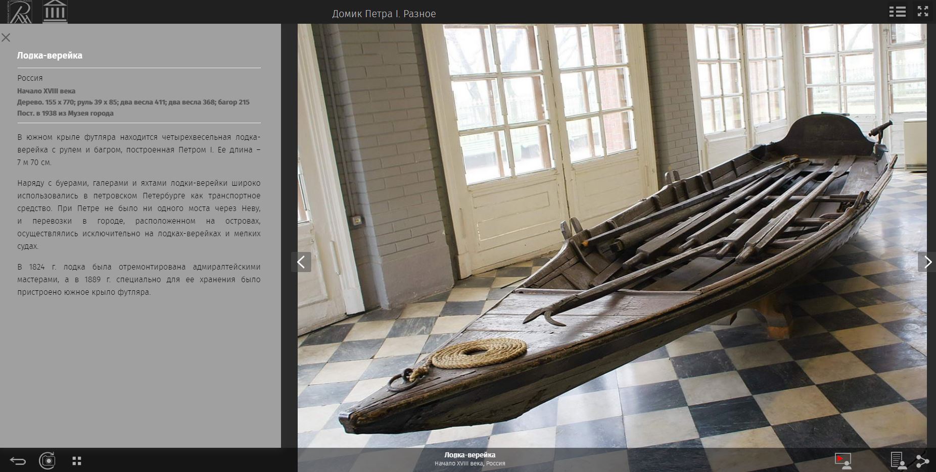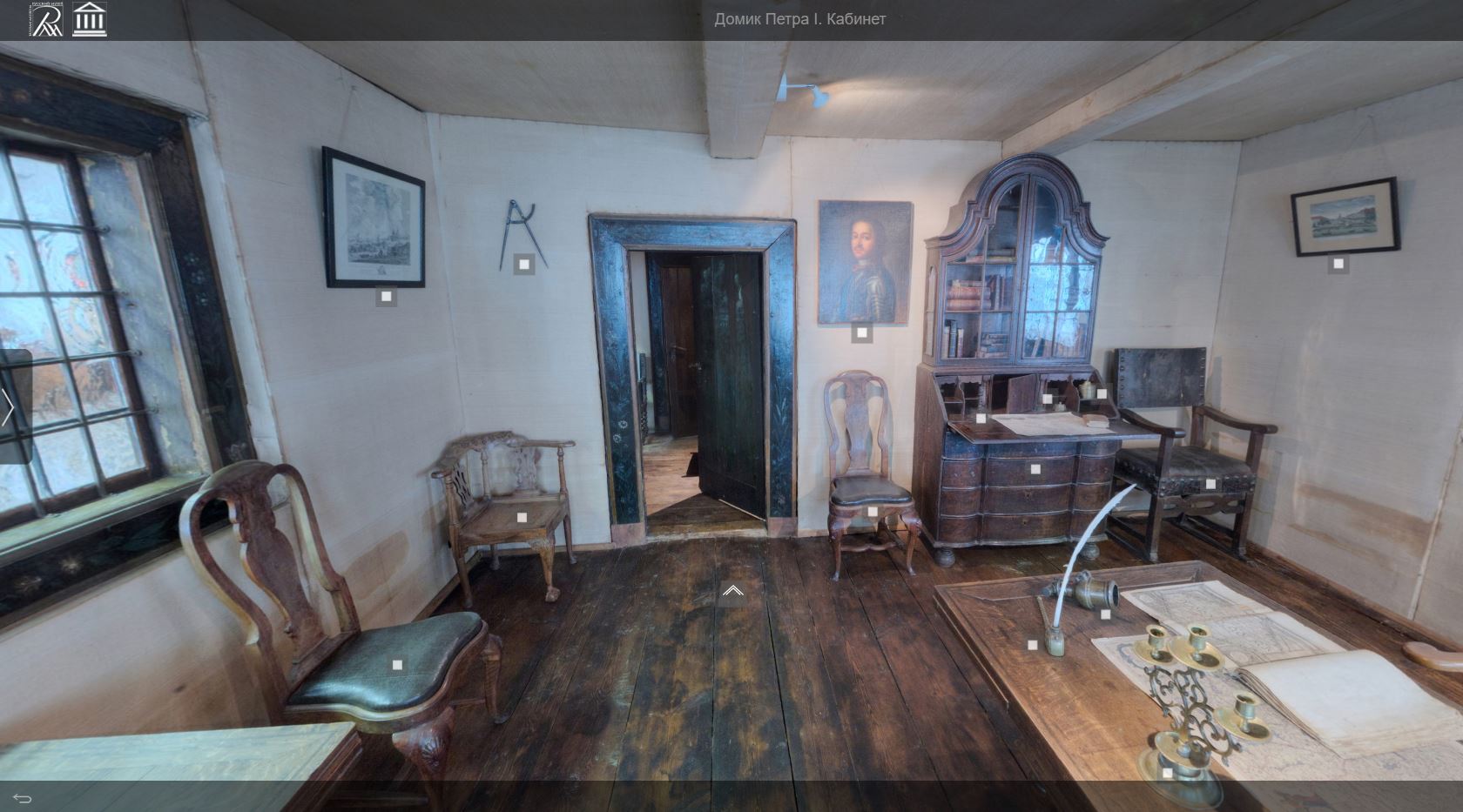 Показать полный текстУдобная навигация виртуального тура позволяет изучить вводную экспозицию и осмотреть три основных помещения внутри домика — кабинет, столовую и спальню. В домике находится около 70 предметов быта петровской эпохи — мебель (в том числе кресло, изготовленное самим Петром), оловянная и медная посуда, мундирное платье капитана Преображенского полка, принадлежавшее Петру I. Можно не только самостоятельно изучить и рассмотреть все эти экспонаты, но также посмотреть видеоэкскурсию хранителя домика Надежды Александровой об истории домика и наиболее интересных предметах, непосредственно связанных с именем Петра I, а также видеолекцию «История сохранения домика Петра I».