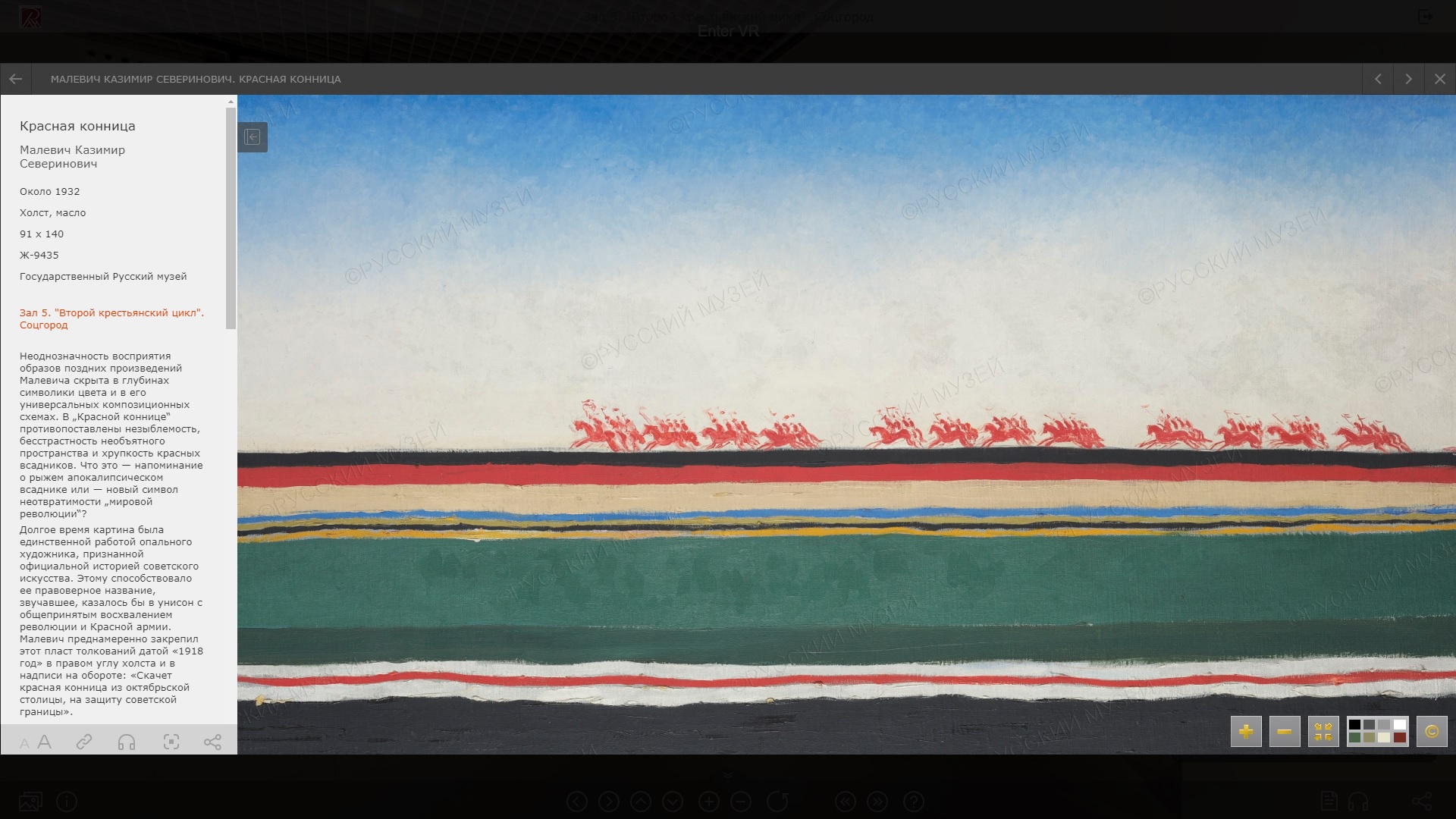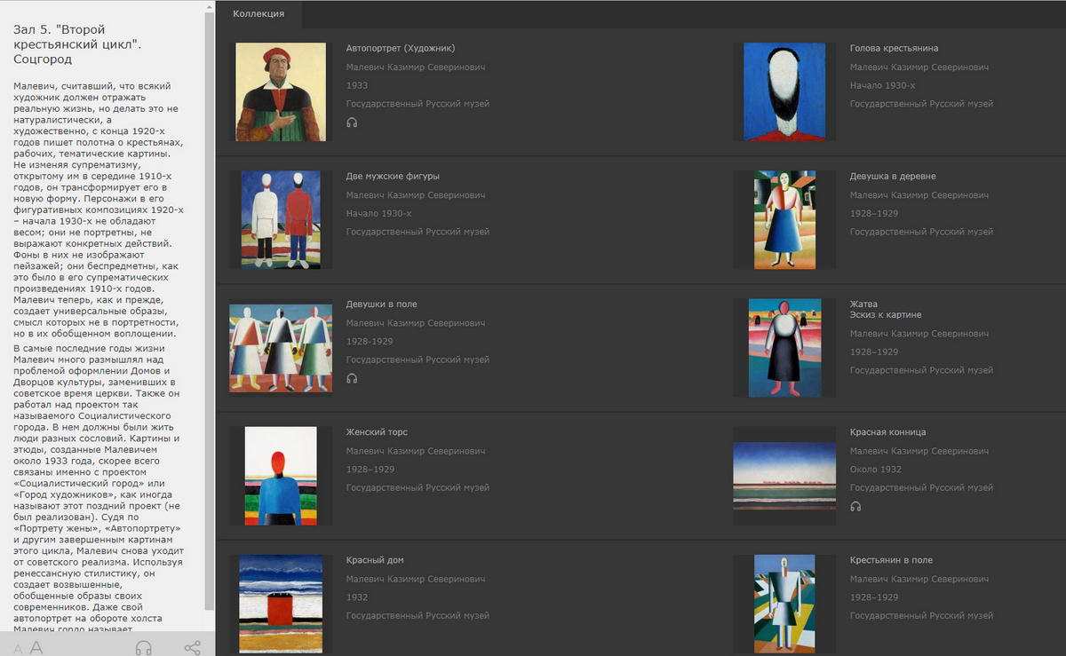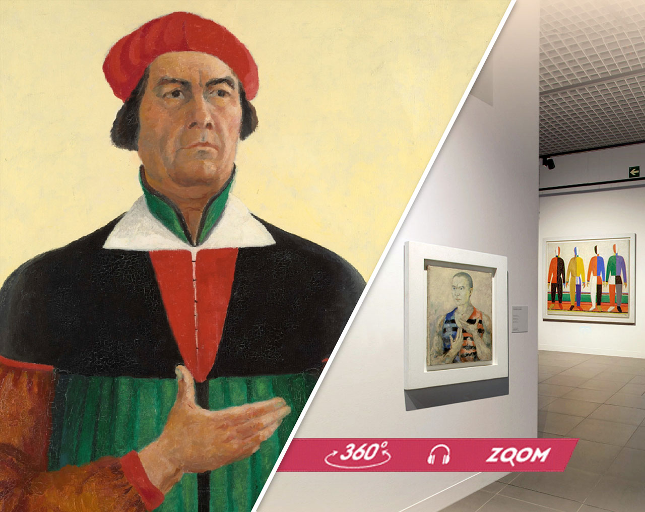 Виртуальный тур по выставке произведений Казимира Малевича в Малаге позволяет увидеть около пятидесяти работ мастера, раскрывающих творческий путь мастера: от раннего творчества художника до всемирно известных произведений и супрематизма, ставшего классикой.  Среди них «Красный квадрат» (1915) , «Супрематизм № 56» (1916),  «Скачет красная конница» (1928–1932), «Спортсмены» (1930–1931), «Сложное предчувствие» («Торс в желтой рубашке») (1932), «Автопортрет» (1933) и другие. Экспозицию дополняют арихитектон, костюмы, созданные по эскизам Малевича для реконструированной оперы-мистерии «Победа над солнцем» (1913), посмертная маска художника, снятая Николаем Суетиным, и слепок руки живописца.