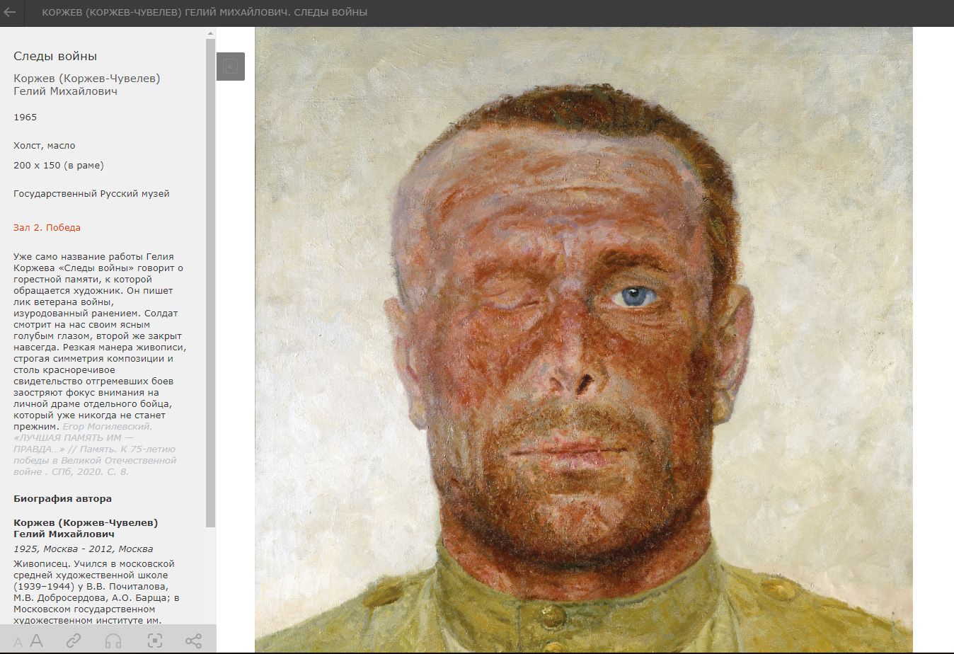 Выставка посвящена 75-летию Победы в Великой Отечественной войне. В состав выставки вошло более 50 произведений живописи и скульптуры из собрания Русского музея, выполненных в послевоенное время, с 1945 по 2010-е годы.