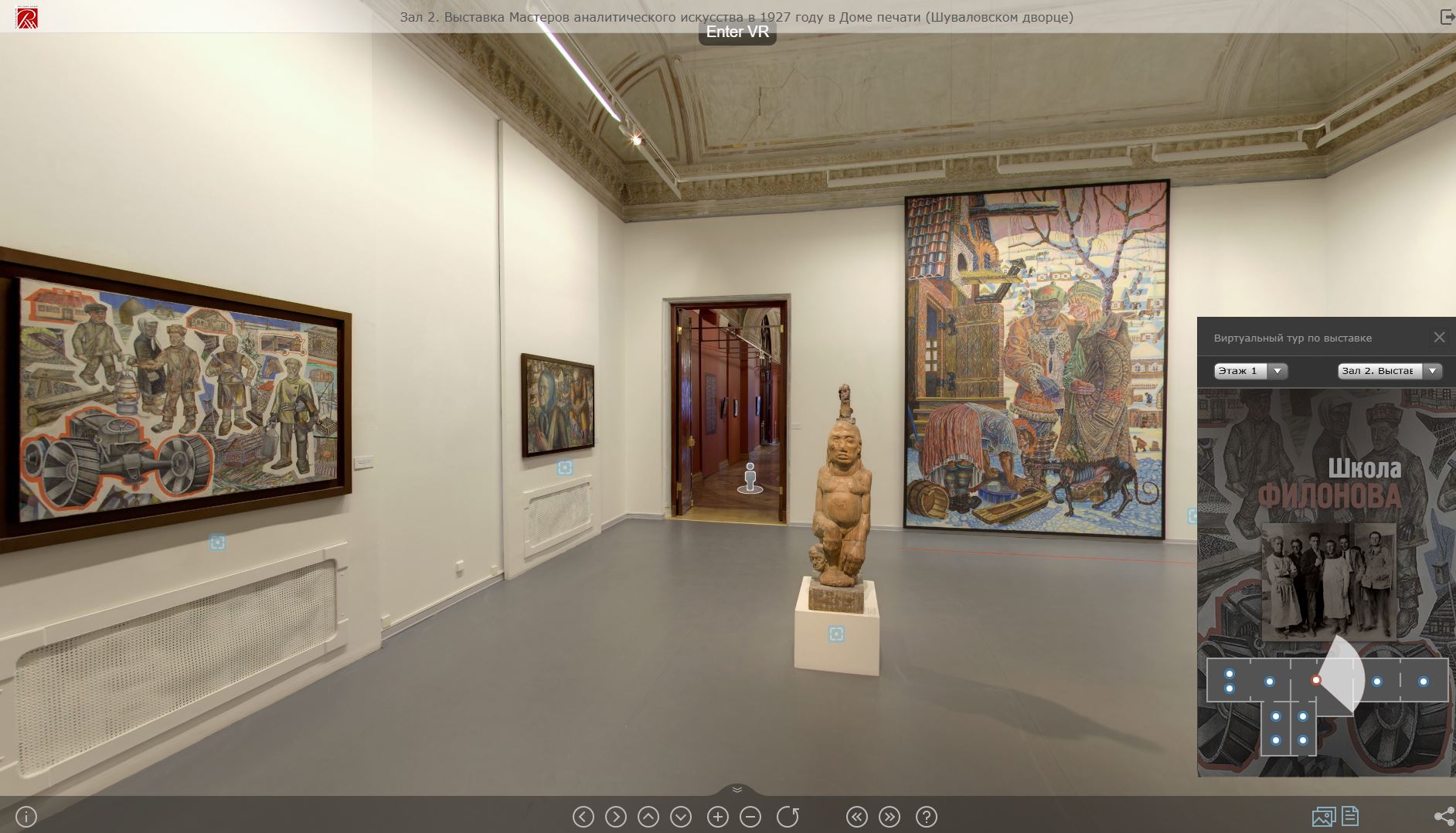 Благодаря технологии панорамной съемки виртуальный тур полностью воссоздает пространство экспозиции, позволяет детально рассматривать экспонаты, снятые в высоком разрешении, изучать аннотации.
