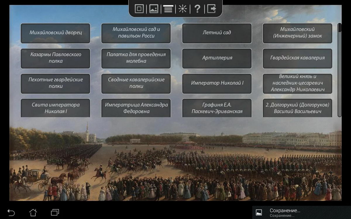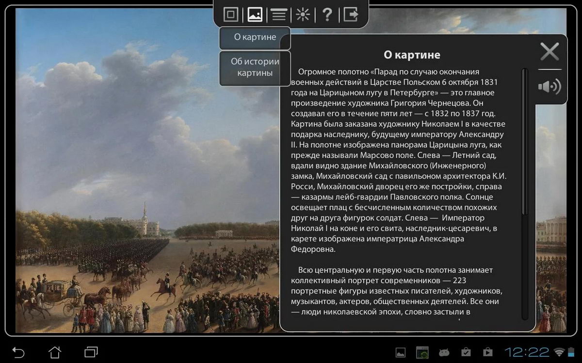 Мобильное приложение "Русский музей. Чернецов. Парад" посвящено самой известной картине Григория Чернецова «Парад по случаю окончания военных действий в Царстве Польском 6 октября 1831 года на Царицыном лугу в Петербурге» (1837).