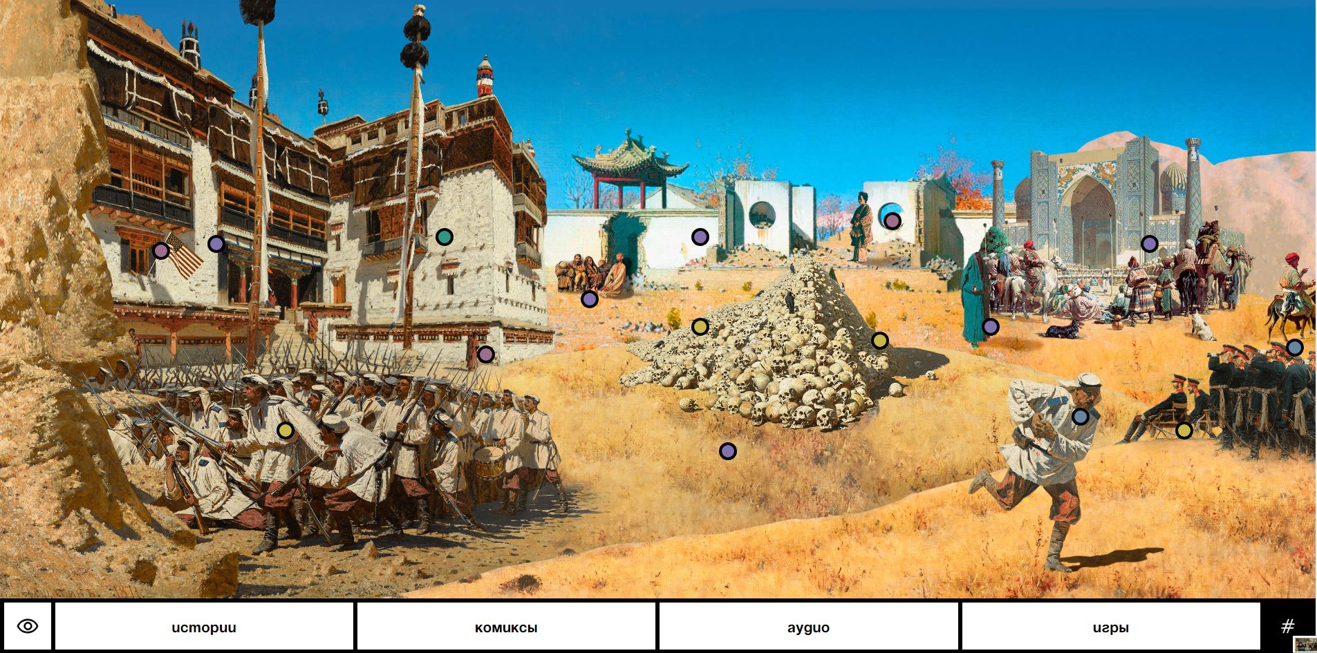 «Верещагин и мир в огне» — специальный онлайн-проект при поддержке Государственной Третьяковской галереи. Интересные истории, тесты, аудиорассказы о разных гранях творчества художника. |